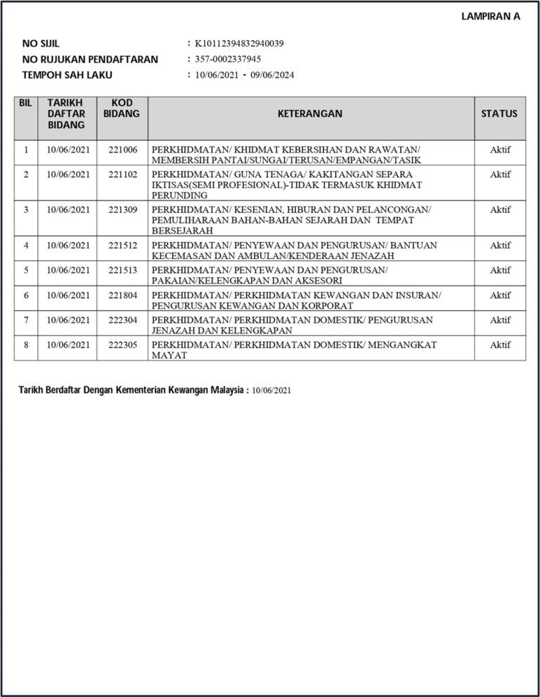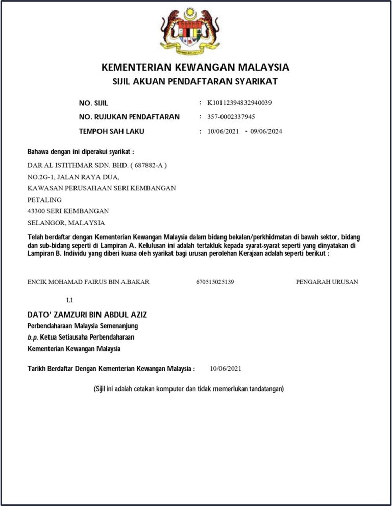 PERAKUANSijil PerakuanSyarikat kami telah menperolehi perakuan dari pihak kerajaan serta kepercayaan sebagai rakan korporat dari ejensi swasta. Sijil Akuan Pendaftaran SyarikatKementerian Kewangan Malaysia (MOF) AWARIS – Rakan Korporat
